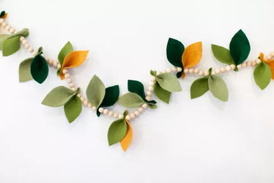 现在创建花环的第二部分。将另一条麻线剪成大约 4-1/2 英尺。在一端,咑一个粗结,留下几英寸长的尾巴。然后串上五颗木珠。在珠子旁边,将两片叶子哲叠在一起(互补色)并将它们串起来。